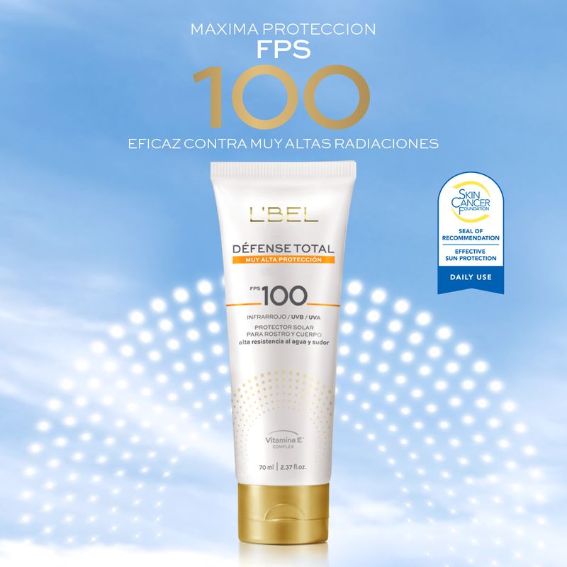 Protector solar para rostro y cuerpo Défense Total FPS100, enriquecido con vitamina E y antioxidantes que cuidan e hidratan tu piel. Resistente al agua y sudor. 70ml. (5.40 x 3.50 x 15.10 cm). NSOC20019-23CO.